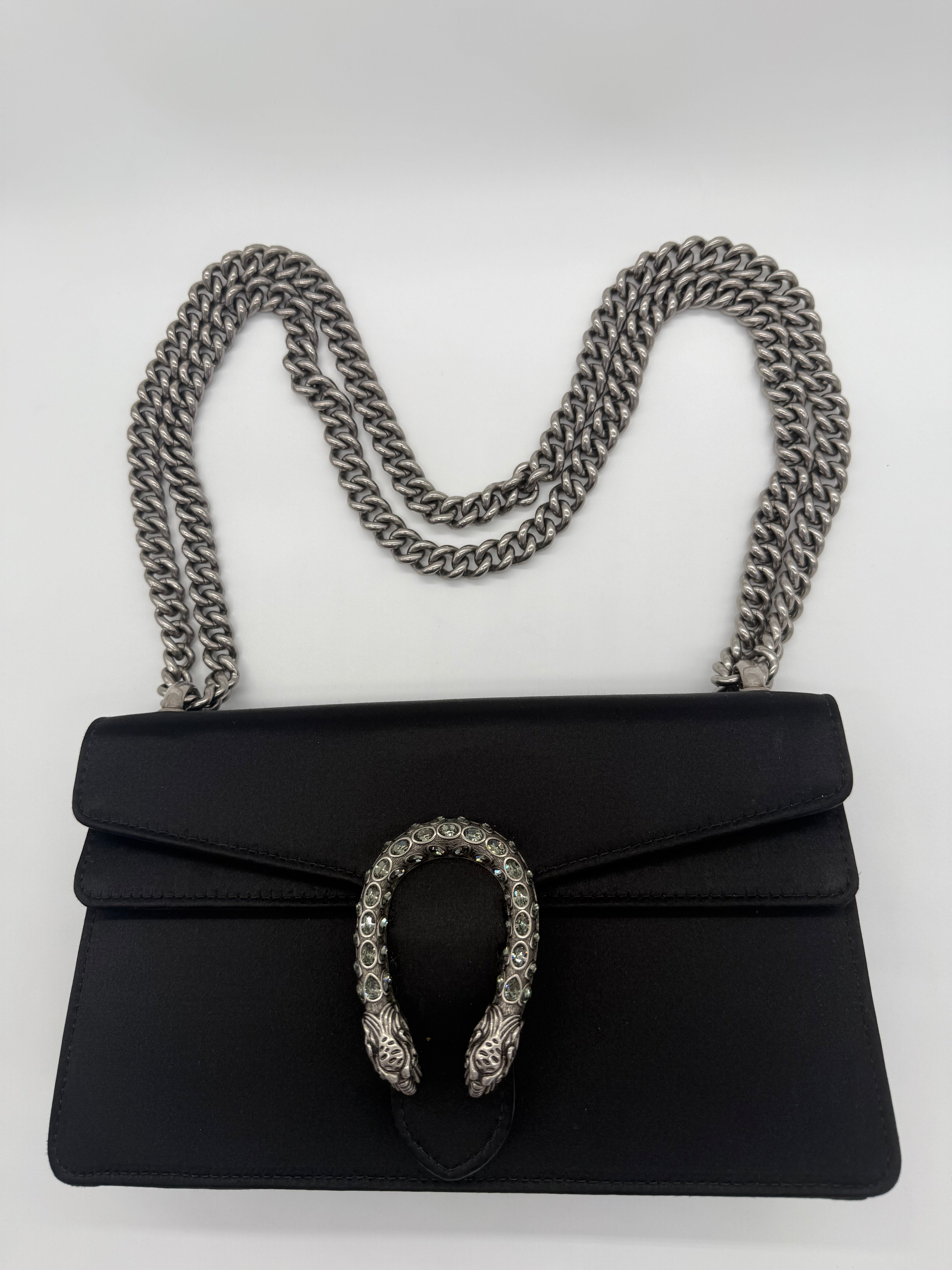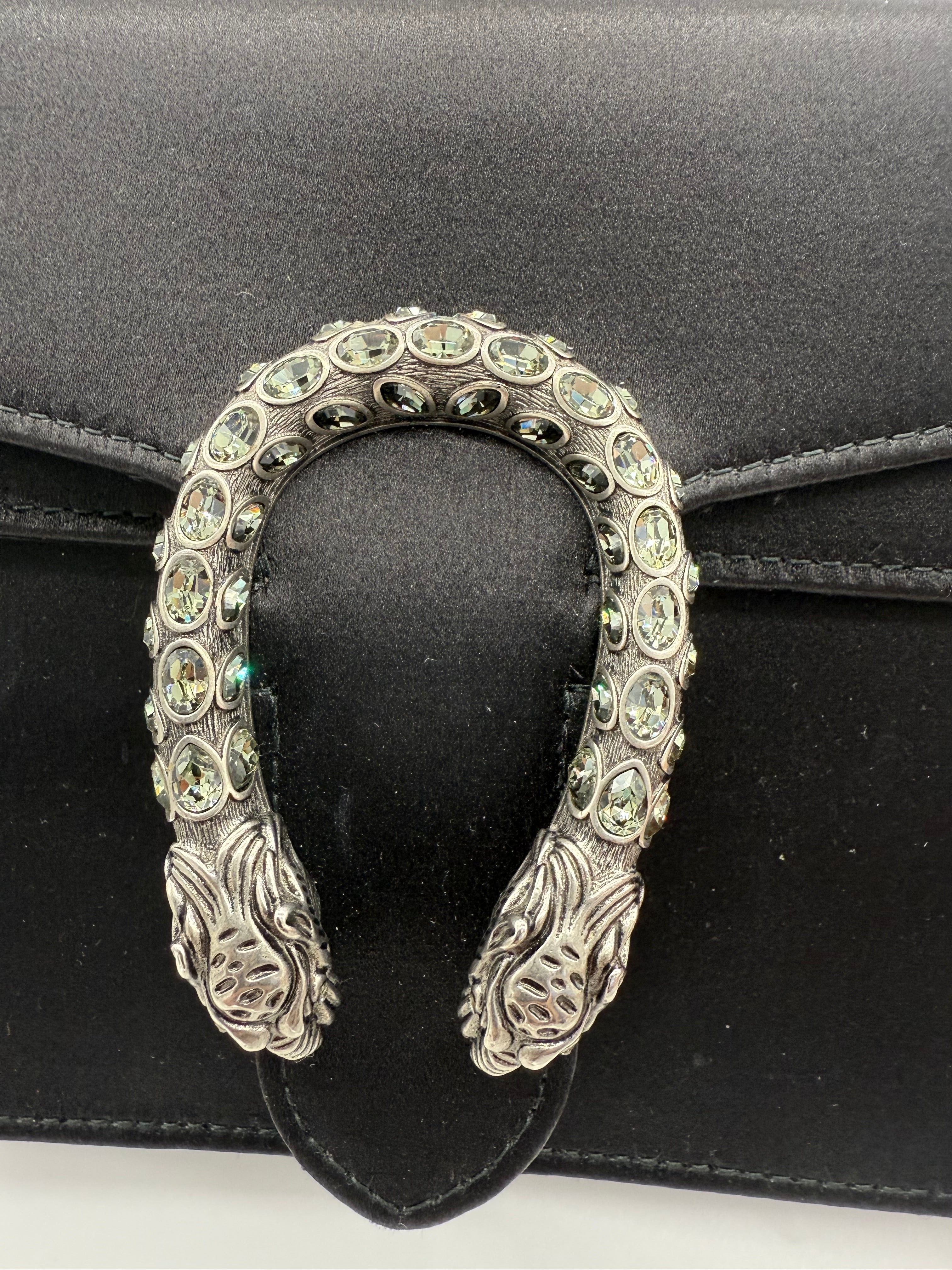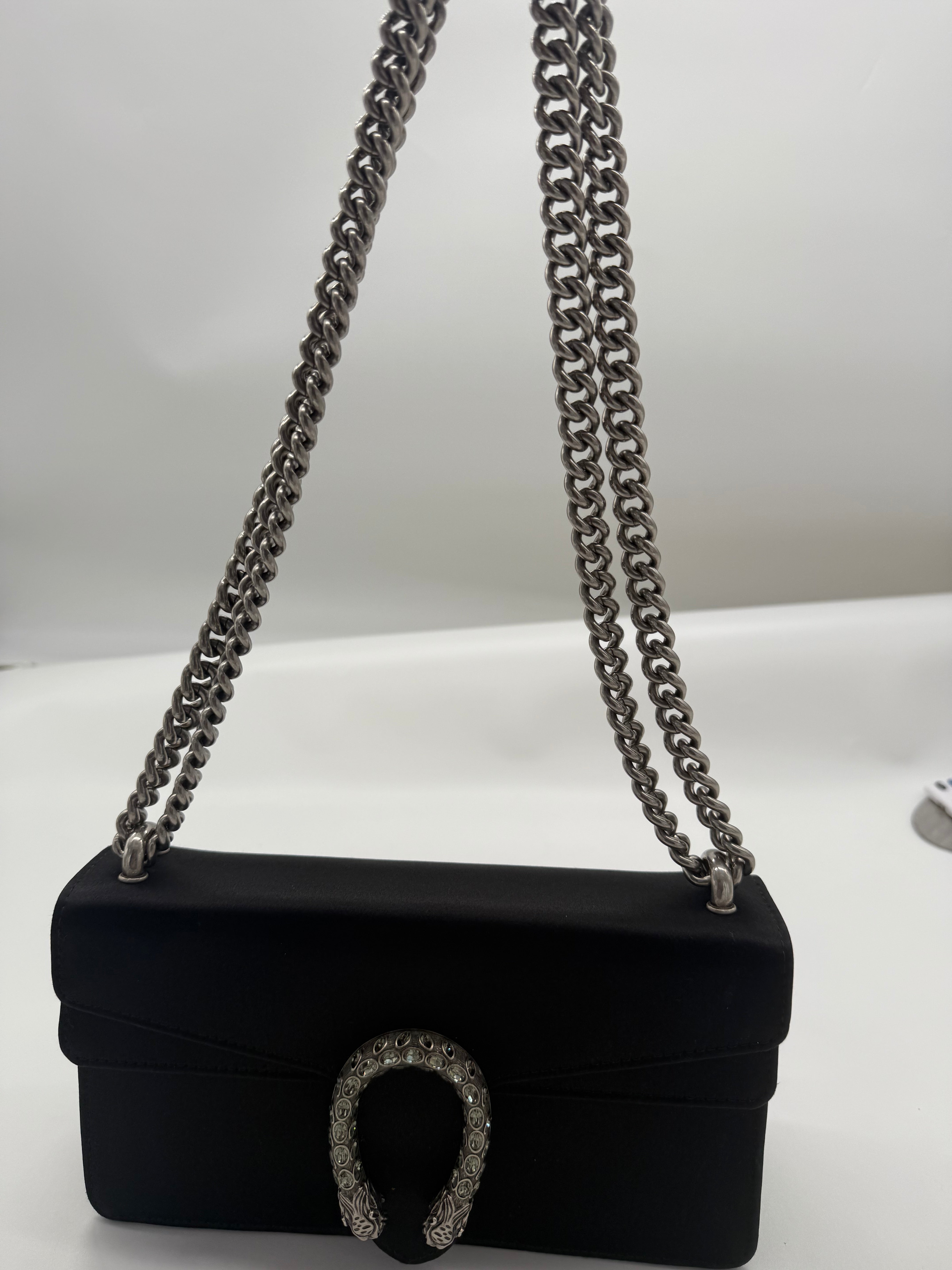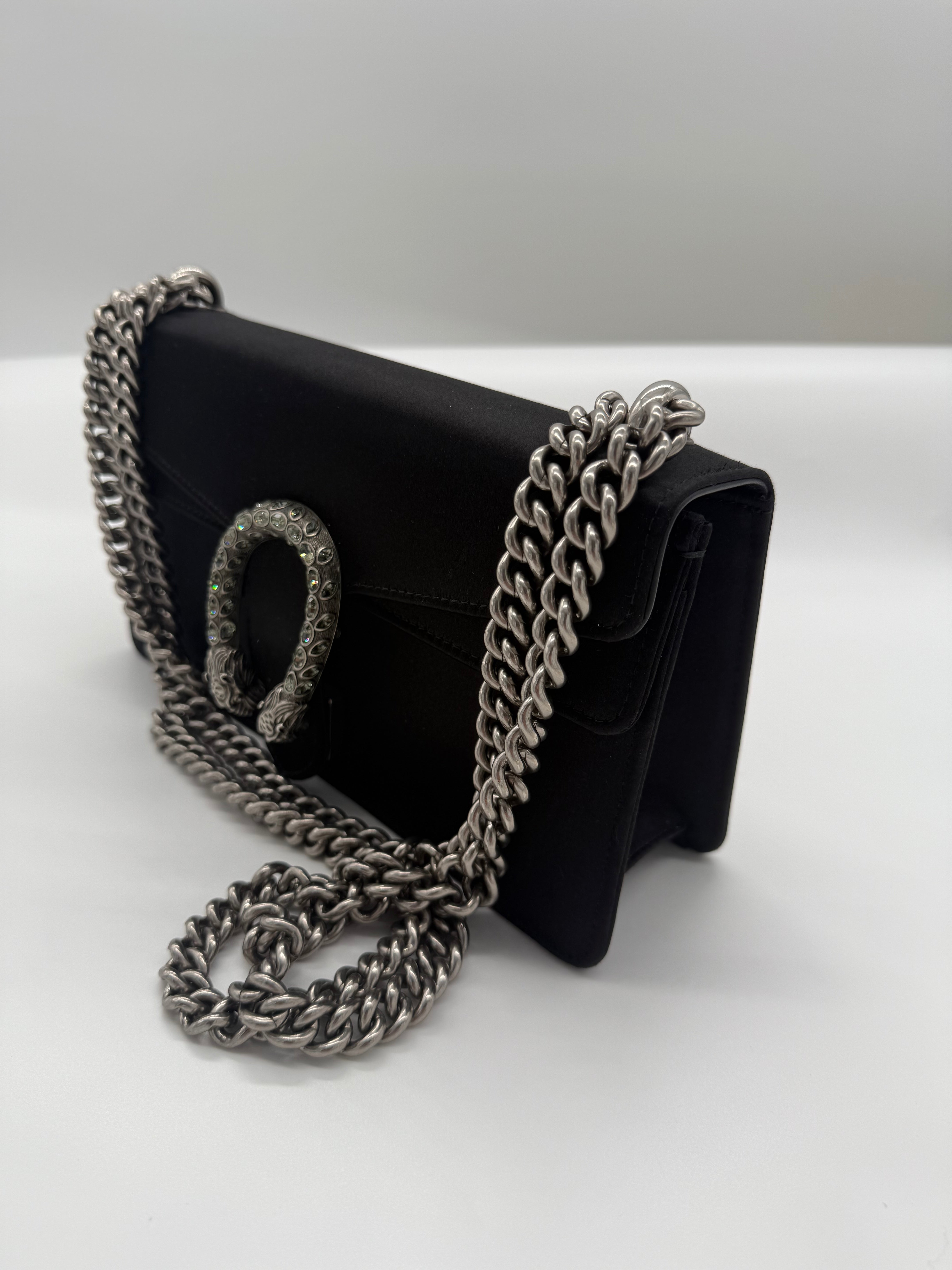 Experience timeless luxury with the Gucci Black Satin Medium Dionysus bag. Its sleek satin finish and signature horsebit detail offer a sophisticated look that elevates any outfit. The medium size provides ample space for essentials while maintaining a compact, elegant profile. Perfect for both day and evening wear, this bag combines iconic design with practical style for those who appreciate refined craftsmanship.
